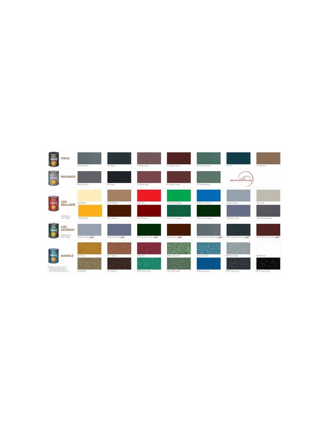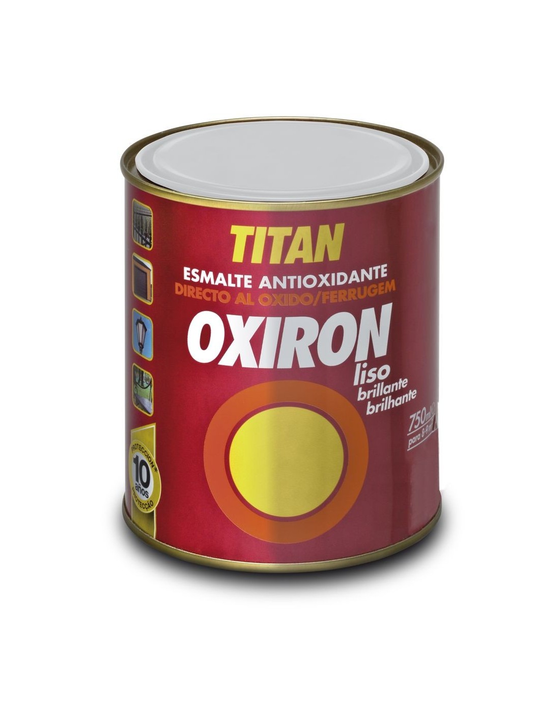 OXIRON Acabado: BRILLANTE Color: PLATA 4520 Base: DISOLVENTE Esmalte antioxidante de secado rápido de aplicación directa sobre acero, sin necesidad de imprimación previa. Proporciona una excelente resistencia a la intemperie de hasta 10 años y un acabado de alto brillo, de gran adherencia, dureza y resistencia a los golpes y arañazos. El uso de Oxirón Liso aporta ahorros importantes en tiempo, ya que se puede repintar a partir de 1 hora, finalizando la mayoría de trabajos en un solo día. RECOMENDACIONES GENERALES: Las superficies a pintar deben estar desengrasadas, secas y exentas de óxido suelto, calamina y suciedad. Es importante tener en cuenta los tiempos de repintado para obtener acabados de alta calidad. No deben transcurrir más de 4 horas entre capas, ya que sino se deberán esperar 5 días. Caso de repintar después de las 4 horas, pueden aparecer arrugados en la superficie aplicada. En la aplicación a pistola, se pueden aplicar capas sucesivas transcurridas 15 - 30 minutos. SUPERFICIES NO PREPARADAS: Hierro o acero: se puede aplicar directamente sin imprimación. Si la superficie presenta herrumbre, lijar suavemente para conferir rugosidad al sustrato, eliminando el óxido mal adherido. En ambientes de corrosión media se debe lijar el acero hasta grado ST 3 de la norma UNE EN ISO 8501-1. En estas condiciones será necesario un grosor mínimo de 140 micras (3 manos secas). Zinc, latón, galvanizado: Lijar hasta matizar y aplicar Preparación Multiuso. Madera: Protector TITAN, Selladora TITAN o Preparación Multiuso. Otros soportes: Consultar. MANTENIMIENTO SUPERFICIES YA PINTADAS EN BUEN ESTADO: Lavar con agua jabonosa y dejar secar, lijar suavemente y aplicar directamente Oxirón Liso. MANTENIMIENTO SUPERFICIES YA PINTADAS EN MAL ESTADO: Eliminar mediante lija de esmeril o cepillo de púas el óxido y recubrimientos de pintura mal adheridos. Para la aplicación del acabado, proceder como en superficies no preparadas. Gran adherencia. Resistente al roce y rayado 10 años. Superficies aplicación: VERJAS , BANCOS, ELECTRODOMESTICOS, PUERTAS, Aplicación Interior: SI; Aplicación Exterior: SI RENDIMIENTO 6-9m2; SECADO 30-60 min; REPINTADO Mínimo: 30 minutos. Máximo: 4 horas o pasados 5 días